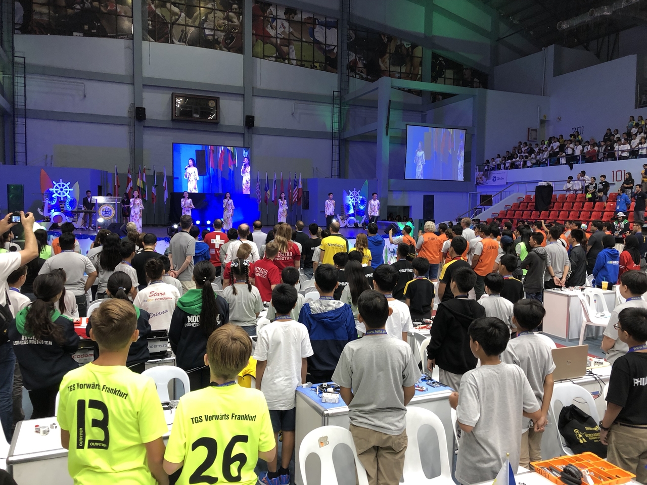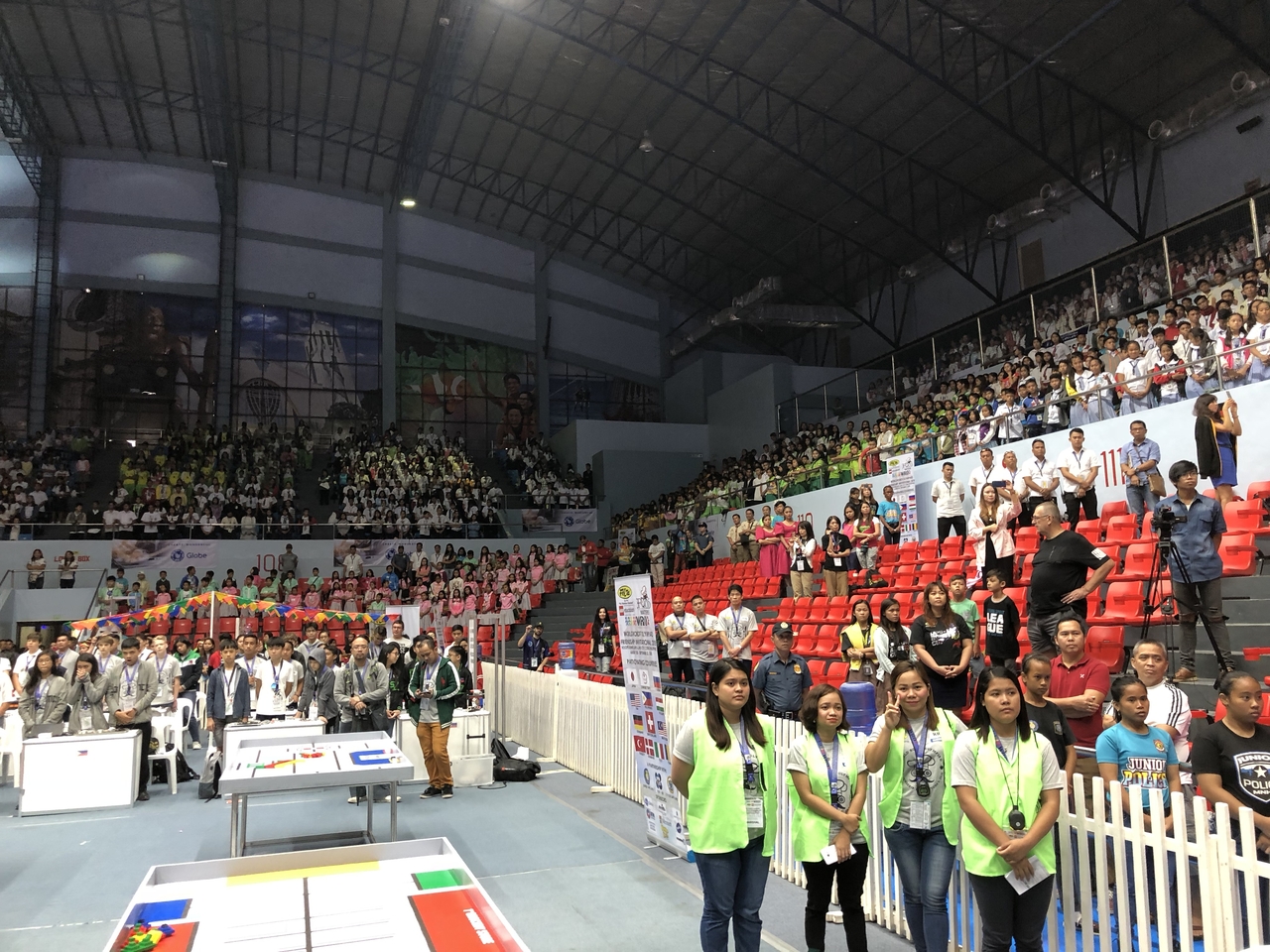 Freitagmorgen, welcome to the „Hoops Dome“. Normalerweise ein Basketballarena mit ca. 6.000 Zuschauerplätzen – welche auch schon gut gefüllt sind als wir ankommen. Die Örtlichen Schulen sind in großer Anzahl erschienen um beim Wettbewerb zuzusehen. Dem entsprechen ist die Geräuschkulisse in der Halle, das Publikum hat gute Laune, es wird regelmäßig laut gejubelt. Dann erst mal Eröffnungsreden, Tanzvorführung, Einmarsch der Teams mit Flaggen, Nationalhymne der Philippinen und Coach-Meeting. Die Überraschungsaufgabe des ersten Tages: die Barriere vom Ziel wird vor den Startbereich quer an die Bande gestellt. Somit haben alle Teams welche das Konzept „Außen rum an der Band langfahren“ ein Problem. Schön für uns, der erste Lauf misslingt zwar leider, aber im zweiten Lauf fahren wir elegant am Hindernis vorbei und erreichen 145 Punkte. Das Schweitzer Team „00100100“ fährt gleich auf Anhieb 170 Punkte ein. Nach dem ersten Tag liegen wir damit auf Platz 5 von 17 Teams. Abends geht es dann mit dem Bus zum festlichen Gala Dinner.