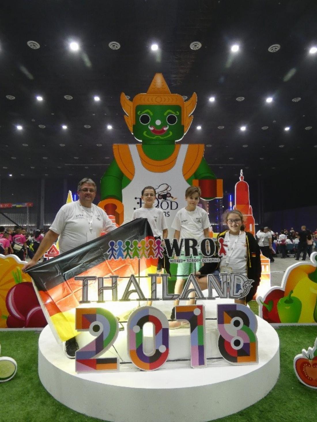 Somit starten wir gut gelaunt nach Passau zum Deutschlandfinale. Der Roboter ist auch besser geworden, die Sensorpositionen wurden verändert und die Programmierung ebenfalls. Wir schlafen nicht besonders gut und so gehen wir am ersten Morgen mit tiefen Augenringen, aber voller Vorfreude in die Dreiländer-Halle. Ganz viele nette Teams, die Berliner am Tisch neben uns sind super nett. Los geht’s - erster Lauf: 80 Punkte – Naja. Zweiter Lauf: enttäuschende 40 Punkte von 170, Platz 6. Der Abend ist gelaufen. Zur Aufmunterung geht unser Team noch in ein Burger-Restaurant. Die Burger kommen, aber einer fällt der Bedienung in Slow-Motion auf den Boden. Auch das noch, wo wir doch so hungrig sind. Wir sind geknickt und schlafen dann auch schlecht. Kann es noch schlechter werden? Ja, am nächsten Morgen beim dritten Durchgang läuft es wirklich noch schlechter: nur 10 Punkte. Es sieht nicht gut aus. Dann, der letzte Lauf. Die ersten Früchte werden richtig sortiert – Hälfte geschafft. Aber dann, oh Nein, eine gelbe Frucht kippt um. Der Roboter dreht sich und, wie es der Zufall will, kommt mit seinem Hinterteil an den gelben Stein und stellt ihn wieder auf. Botti kommt auch noch ins Ziel und hat volle Punktzahl: 170. Zweiter Platz und: WIR FAHREN NACH THAILAND. Das Drehbuch für Passau hätte nicht spannender geschrieben werden können.